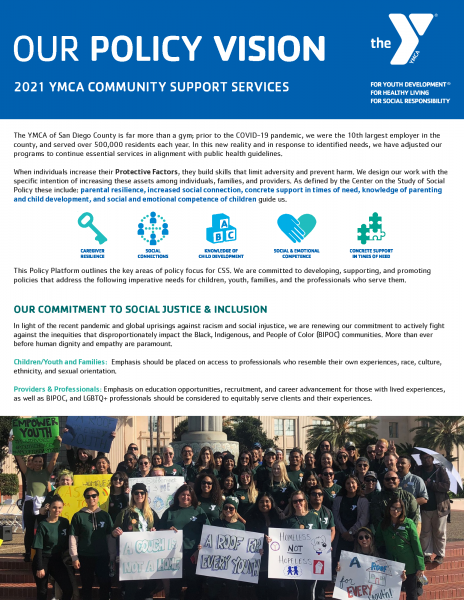 The YMCA of San Diego County is far more than a gym; prior to the COVID-19 pandemic, we were the 10th largest employer in the county, and served over 500,000 residents each year. In this new reality and in response to identified needs, we have adjusted our programs to continue essential services in alignment with public health guidelines. This Policy Platform outlines the key areas of policy focus for CSS. We are committed to developing, supporting, and promoting policies that address the following imperative needs for children, youth, families, and the professionals who serve them.