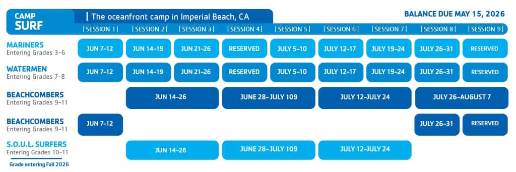 For over 50 years, Camp Surf has facilitated meaningful experiences connecting tens of thousands of youth with the ocean. We remain committed to this mission and the power the ocean has as a backdrop where youth can face and overcome challenges, gain ocean safety and recreation skills, learn social skills, support improved mental health and spend quality time outdoors away from the current pressures of technology and busy schedules. All of our day and overnight campers will continue to have regular safe, convenient and impactful access throughout the camp week to the beach and the Pacific Ocean, whether at Camp Surf or on other local San Diego beaches!