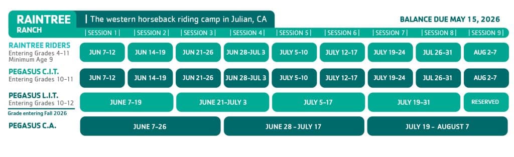 YMCA Raintree Ranch 是一個小型特色過夜營地,專注於騎馬、照顧馬匹和傳統營地樂趣!我們的夏令營為兒童和青少年(9 至 16 歲)提供騎馬的獨特體驗,了解馬匹的個性並學習如何照顧和餵養馬匹。 欲了解更多信息,請聯繫 Sharnaye Neale,電話 sneale@ymcasd.org